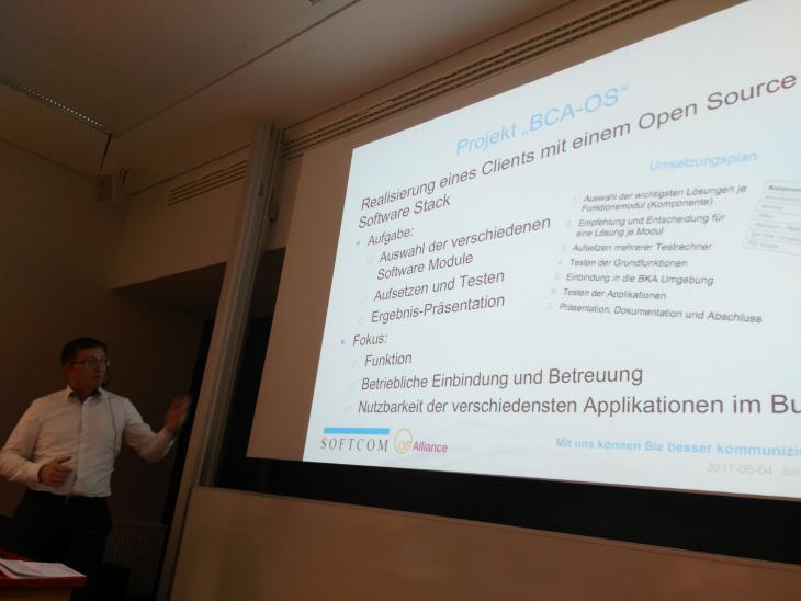 Seit 2015 arbeiten osAlliance Partner mit der Softcom für das Bundeskanzleramt Österreich an der Implementierung von Open Source Lösungen für die Verwaltung. Nun erzählen wir bei den Linuxwochen in Wien erstmals öffentlich davon. David Ayers und Franz Fertl gaben am 4. Mai 2017 um 17 Uhr einen Einblick in die erfolgreiche Migration zu Open Source Datenbanken, den öffentlichen Doodle-Ersatz TERMINO.gv.at, den Kommunikationsdienst ucom (Chat + Videokonferenz + Pad) sowie den Arbeitsplatz der Zukunft mit einem Linux Desktop und einem Exchange - Ersatz. Drei von sechs Projekten sind umgesetzt und laufen in Produktion, bei anderen drei Anwendungsfeldern haben wir gezeigt, dass es geht und Open Source mehr Freiheiten (kein vendor-locked-in) und Kostenvorteile bietet. Zur Umsetzung benötigt es Entscheidungen auf politischer Ebene. Hier gibt es die Folien zum Download.