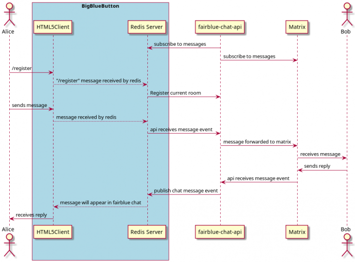 Eine PoC-Implementierung ermöglicht einem unabhängigen node.js Service (basierend auf nest.js) Nachrichten von einem Matrix-Chatraum zu einem BigBlueButton-Meeting weiterzuleiten und umgekehrt. Dafür wird ein Redis message bus genutzt. Der Source Code ist unter der GPLv3 veröffentlicht.