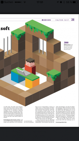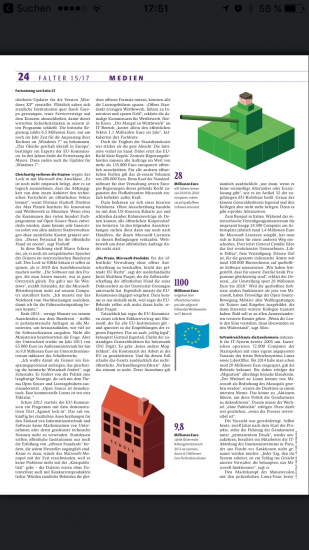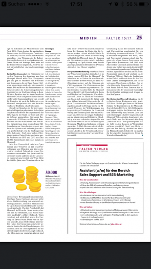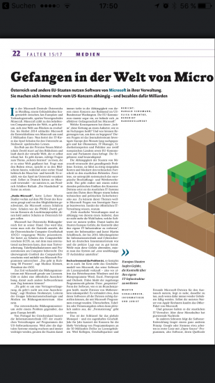 Das Partnermedium für Österreich war der Falter, der löblicherweise sehr eigenständig auch lokale Fakten zusätzlich recherchiert hat. Die beiden Artikel "Gefangen in der Welt von Microsoft" (Falter 15/17) sowie "Das trojanische Pferd" (Falter 16/17) kan man in lesbarer Qualität um € 0,49 nachlesen - die nachfolgenden Scans in unlesbarer Qualität sollen Appetit darauf machen.