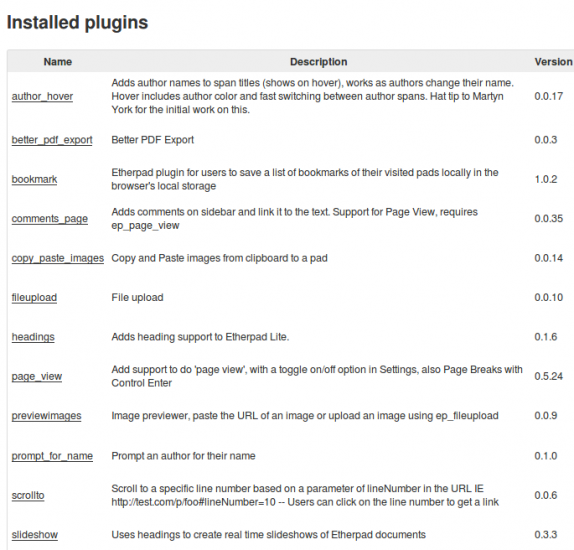After seven years of smooth operation and more than a Gigabyte compressed text only, we had to upgrade to a new Debian stretch operating system and nodejs 6. The latest version of etherpad now allows to go back to any text version or export to ODF, DOC. PDF or HTML. We improved the performance and gave it a new design lately. Now it really looks like a dark green board where you write with chalk and highlight links yellow or orange.