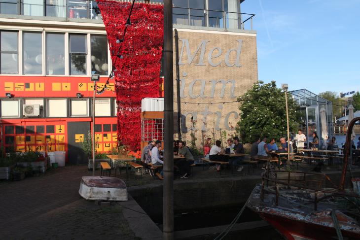 Als temporären Arbeitsort haben wir Mediamatic gefunden, das unweit vom Hauptbahnhof gut erreicht werden kann. Mediamatic setzt spannende Projekte an der Schnittstelle von Kunst, Biologie und Design um, die praktische Möglichkeiten der urbanen Nahrungsmittelproduktion aus Resten erproben, wie z.b. Pilzezucht auf Basis von Resten der Bierproduktion.. Neben Workshops und Kunst-Ausstellungen bietet Mediamatic Eten auch ein Restaurant mit einer gemütlichen Terrasse an.